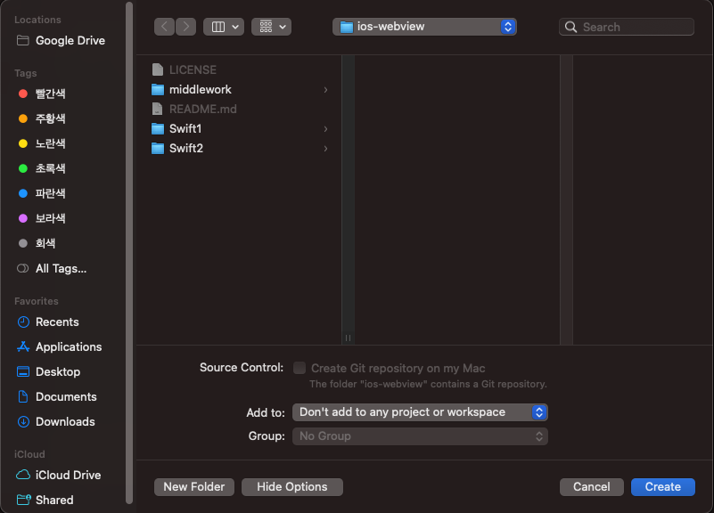 아래와 같이 Swift1, Swift2 등 여러개의 APP에서 공통적인 Swift 소스를 참조하여 사용하려고 한다. 프로젝트 생성 https://dchkang83.tistory.com/97 IOS/Xcode 14X, Swift5.7.2 WKWebView - 기본 Xcode 14.2 기반으로 작성 1.