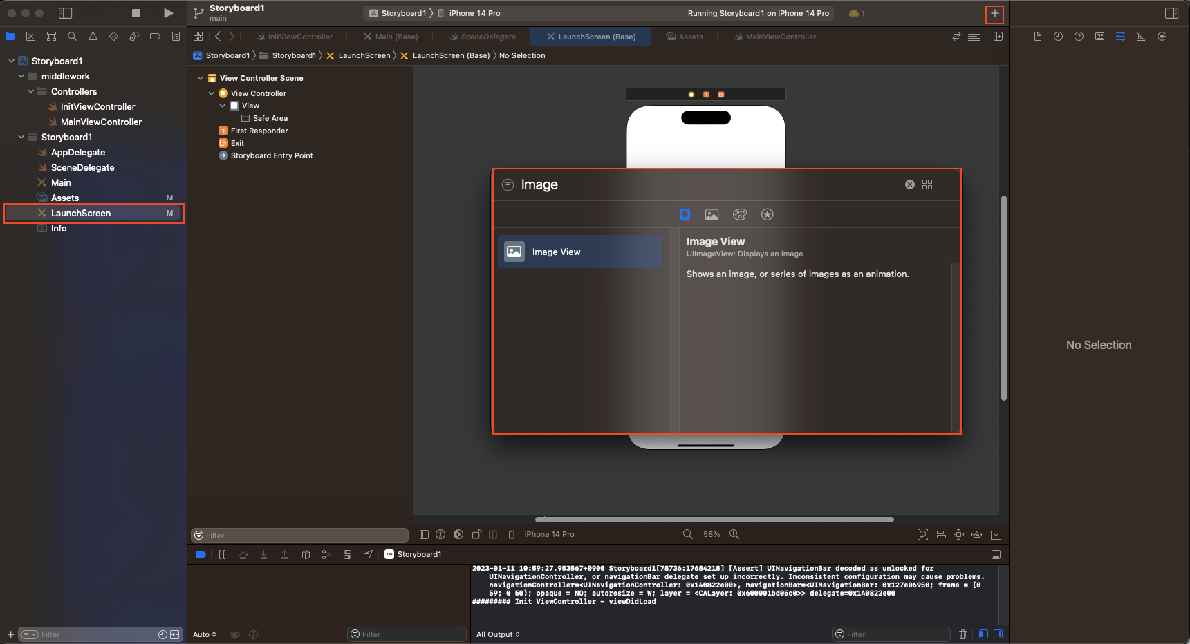 등록되어 있는 Image의 Image View 추가 Image 뷰 Drag&Drop으로 등록하고 Image를 Assets에서 등록한 Splash로 변경해준다.