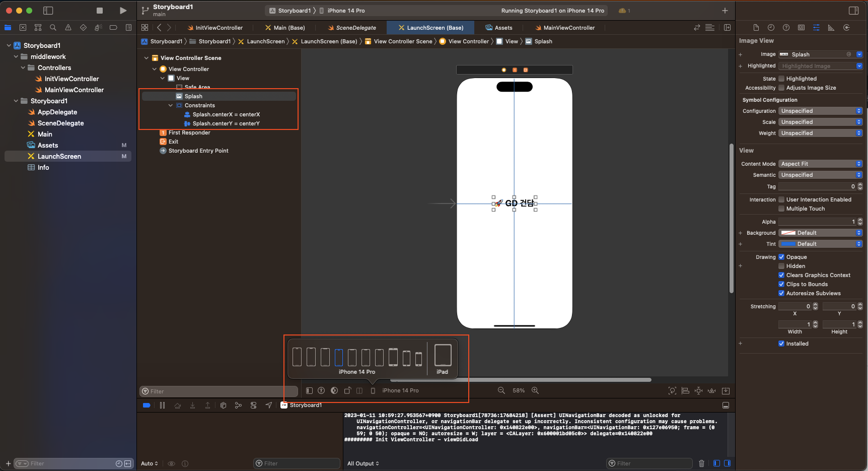 Constraints가 추가되고 위치가 중앙으로 고정되었다. Splash 이미지 크기 변경