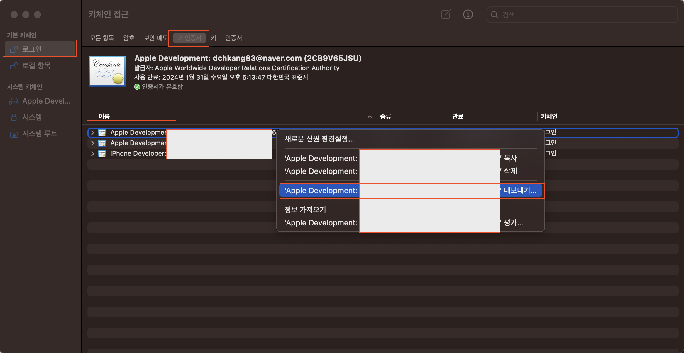 키체인 접근 앱을 실행 로그인 -> 내 인증서 -> 인증서 선택 -> 마우스 우클릭 -> 내보내기