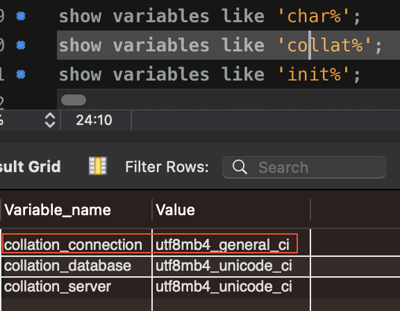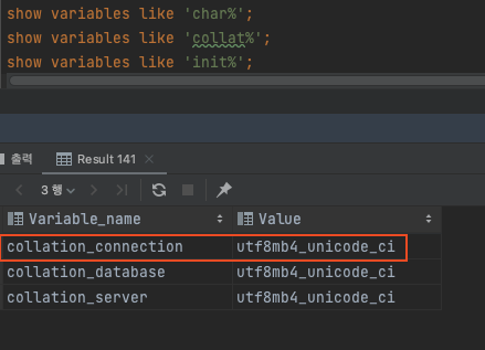 show variables like 'char%'; show variables like 'collat%'; show variables like 'init%';IntelliJ IDEA에서 collation 확인