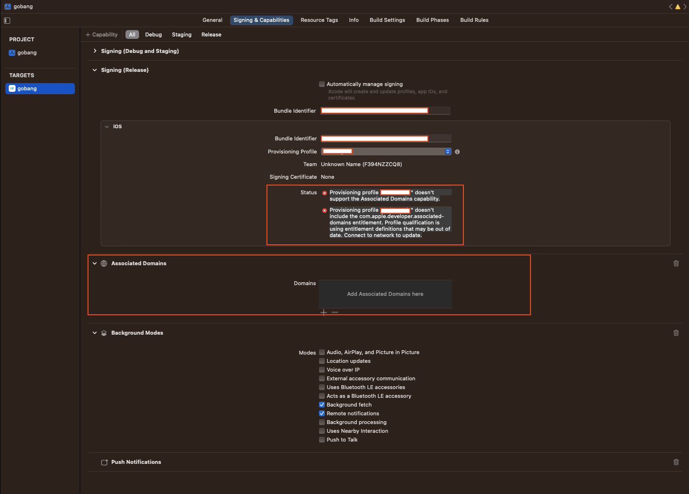 Provisioning profile "XXX" doesn't support the Associated Domains capability.