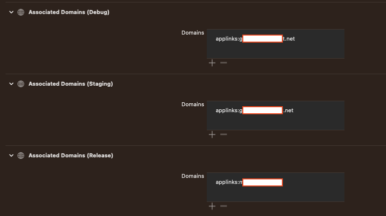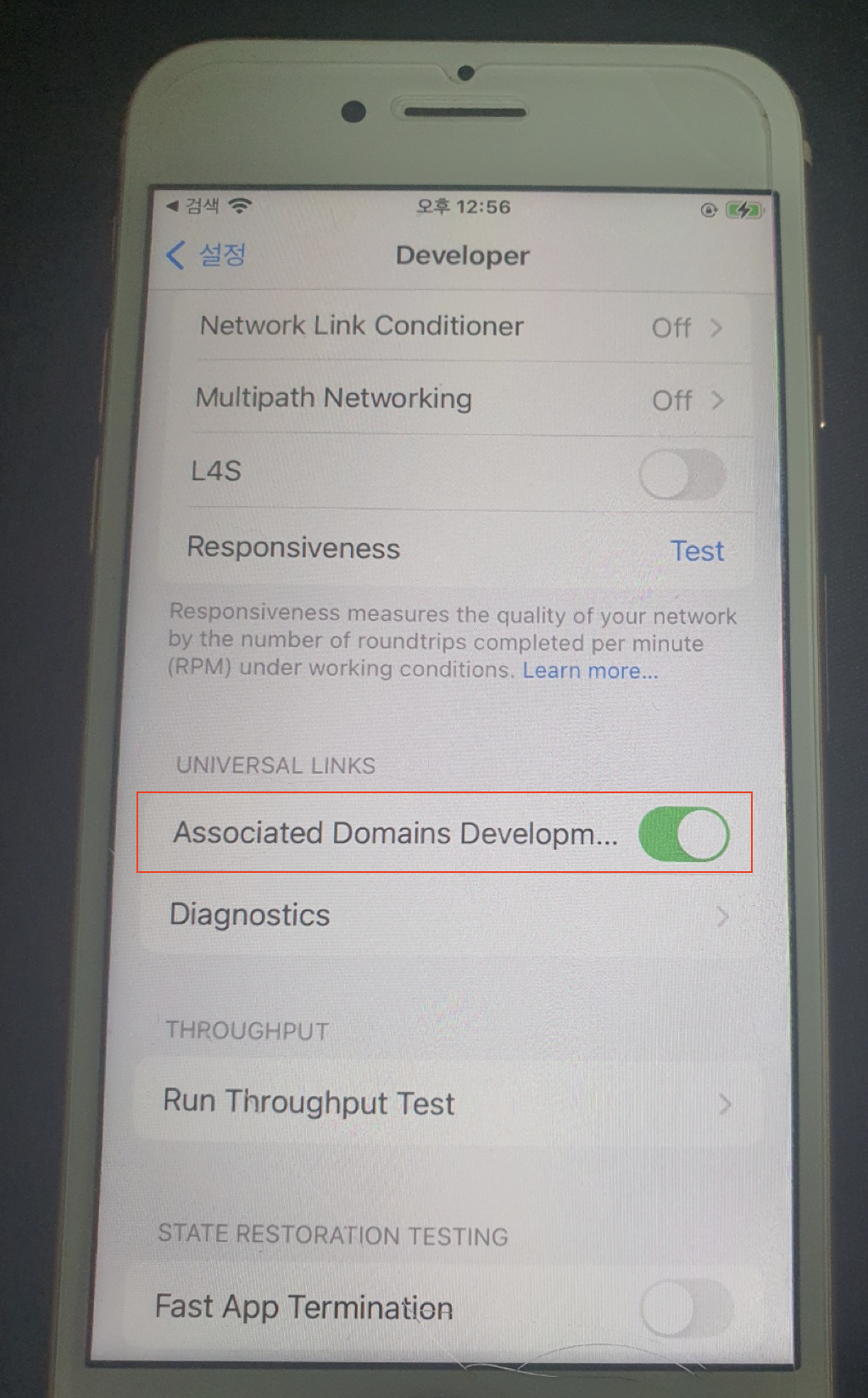 TARGETS -> Debug, Staging -> Associated Domains에 ?mode=developer 파라미터를 추가해 줬다.