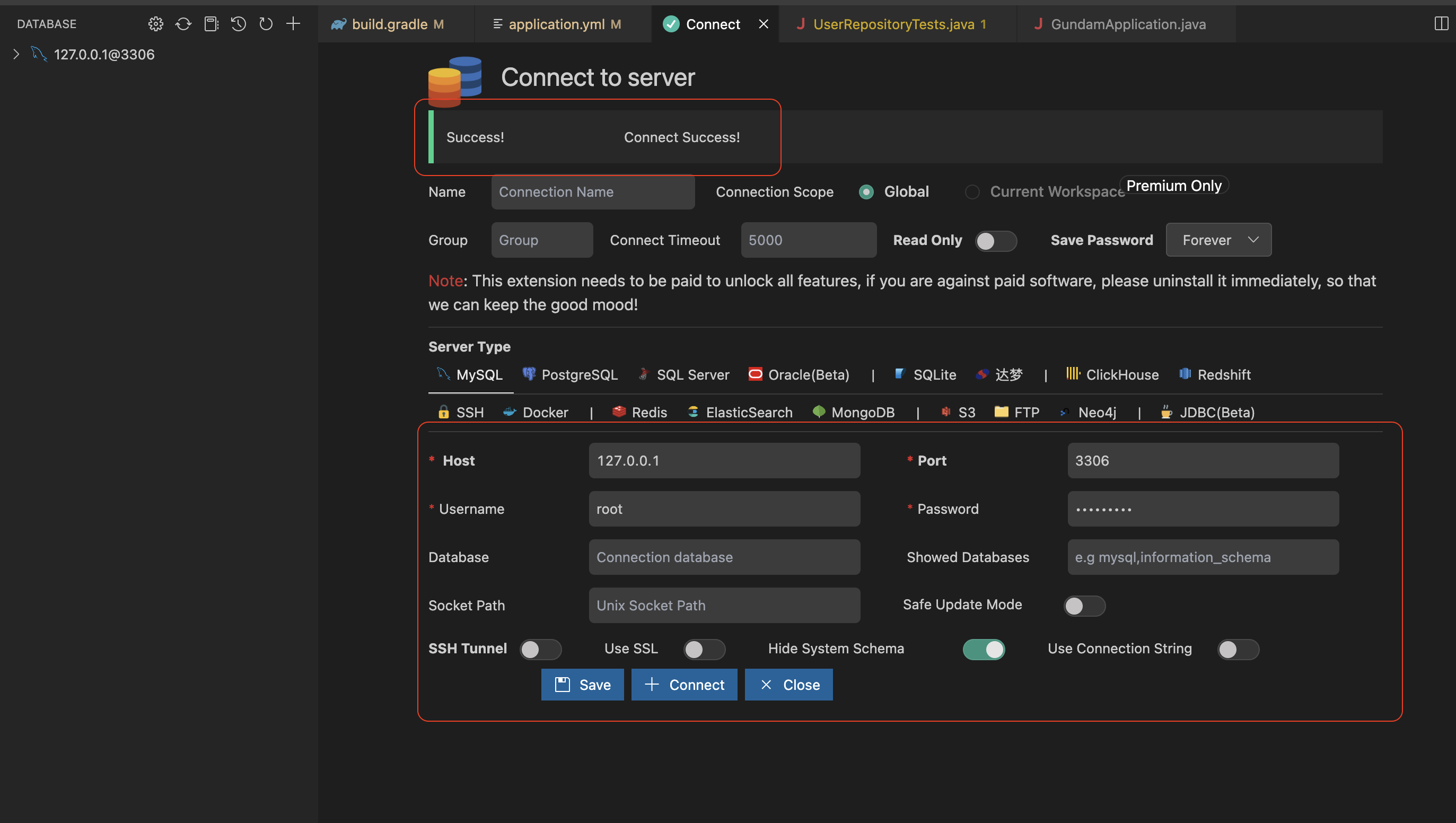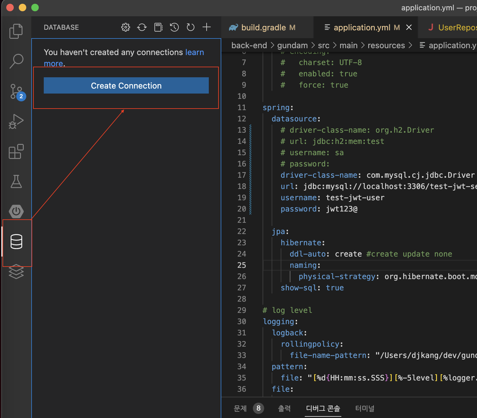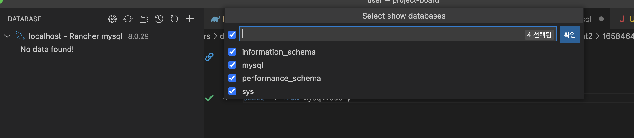 CREATE DATABASE `test-board-server`; CREATE USER 'test-board-user'@'%' IDENTIFIED BY 'test1234@'; GRANT ALL PRIVILEGES ON `test-board-server`.* TO 'test-board-user'@'%'; flush privileges; SELECT * from user;5. mysql connect - 의존성 추가