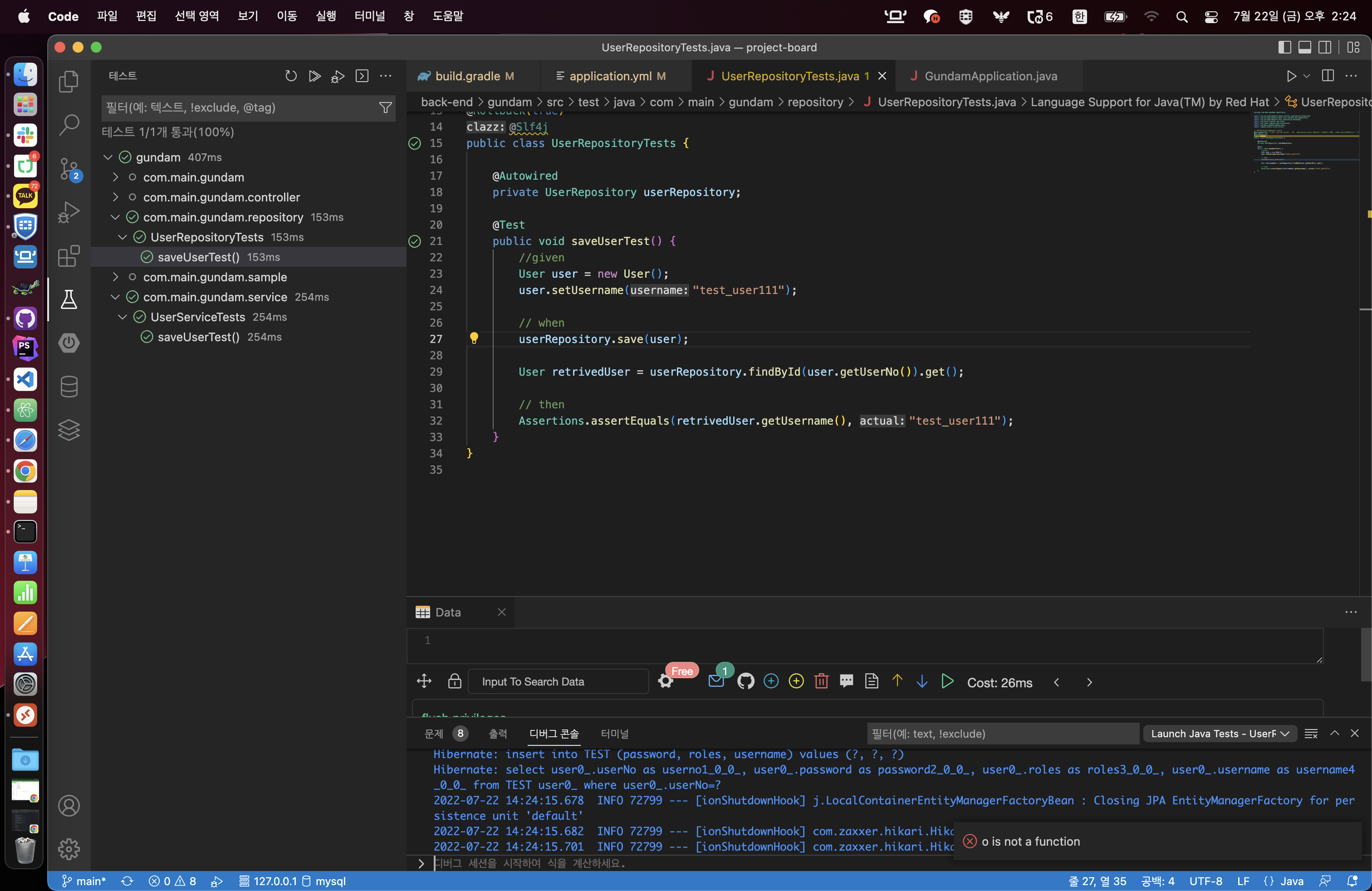 spring: datasource: # driver-class-name: org.h2.Driver # url: jdbc:h2:mem:test # username: sa # password: driver-class-name: com.mysql.cj.jdbc.Driver url: jdbc:mysql://localhost:3306/test-board-server?serverTimezone=Asia/Seoul username: test-board-user password: test1234@7. Repository Test Case 실행 및 확인