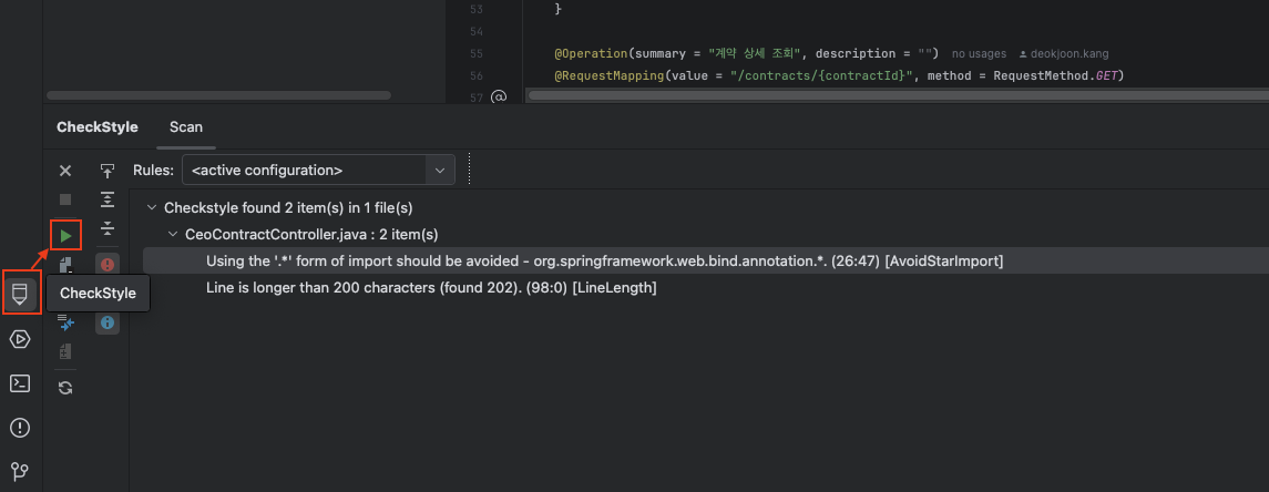 IntelliJ IDEA 하단에 CheckStyle 탭 클릭하면 아래와 같이 뜨고 초록색 재생버튼을 누르게 되면 아래와 같이 Checkstyle에 맞지 않는 부분이 경고로 표시된다.
