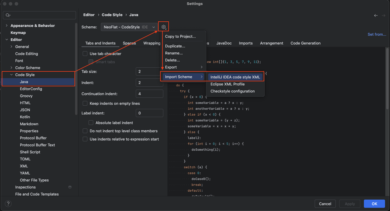 Settings -> Editor -> Code Style -> Java -> 톱니바퀴 -> Import Scheme -> IntelliJ IDEA code style XML -> xml 선택 -> OK -> Apply 1.2. 작동 확인