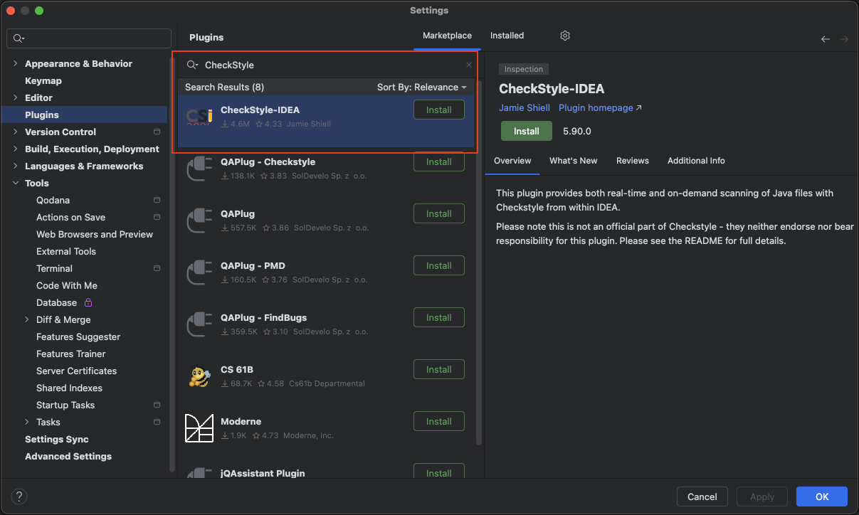 Settings -> Plugins -> `CheckStyle` 검색 -> Install -> IDEA 재시작 2.2. Check Style 설정