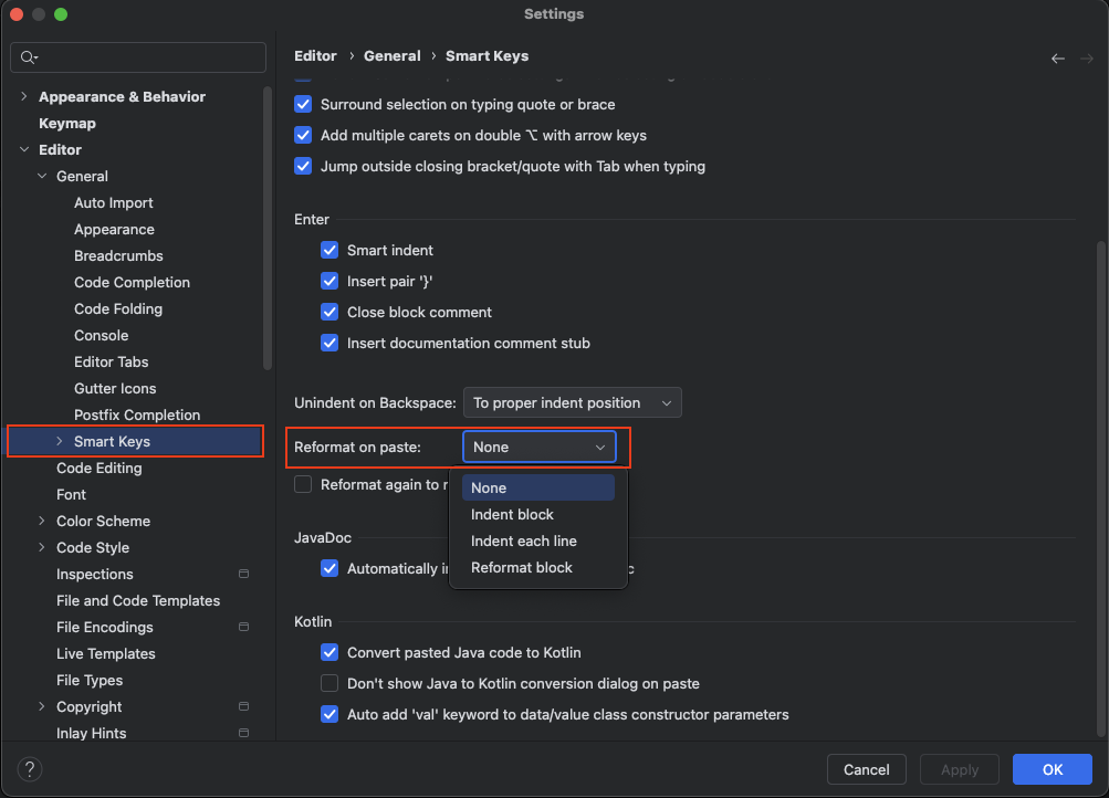 Settings -> Editor -> General -> Smart Keys -> Reformat on paste -> None 2. Check Style 적용