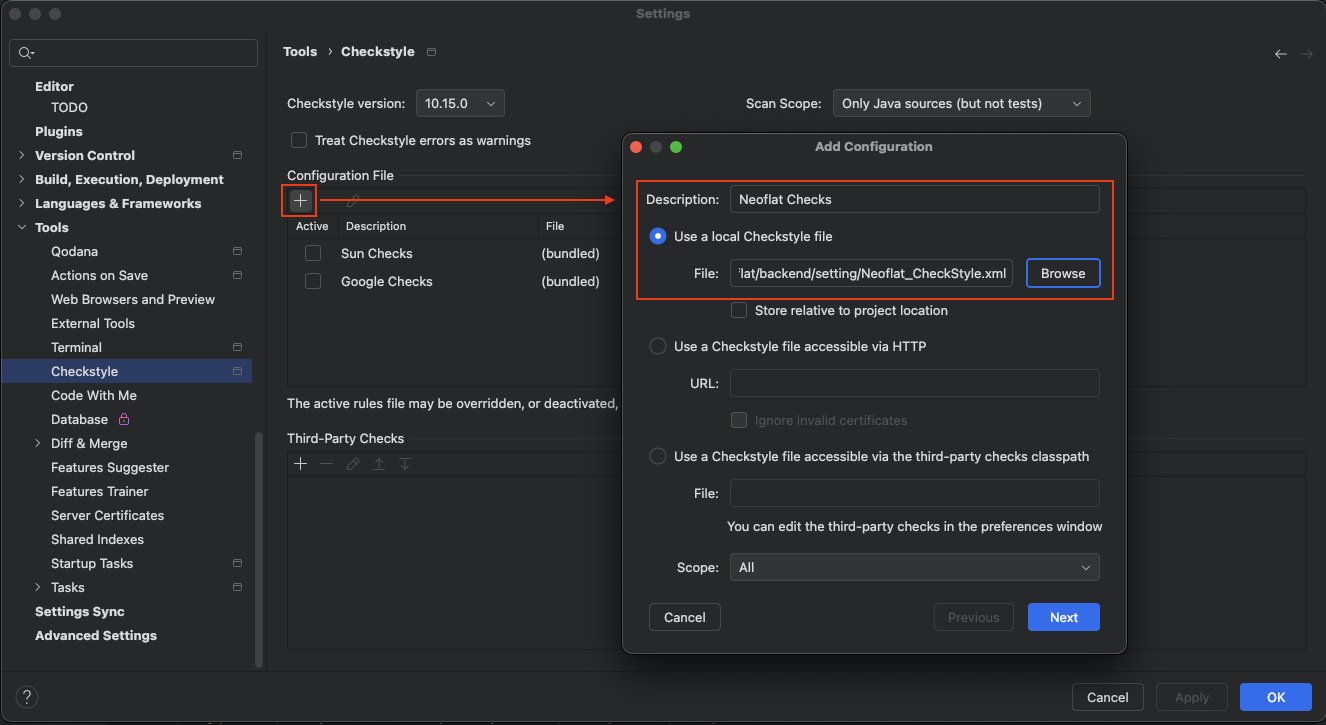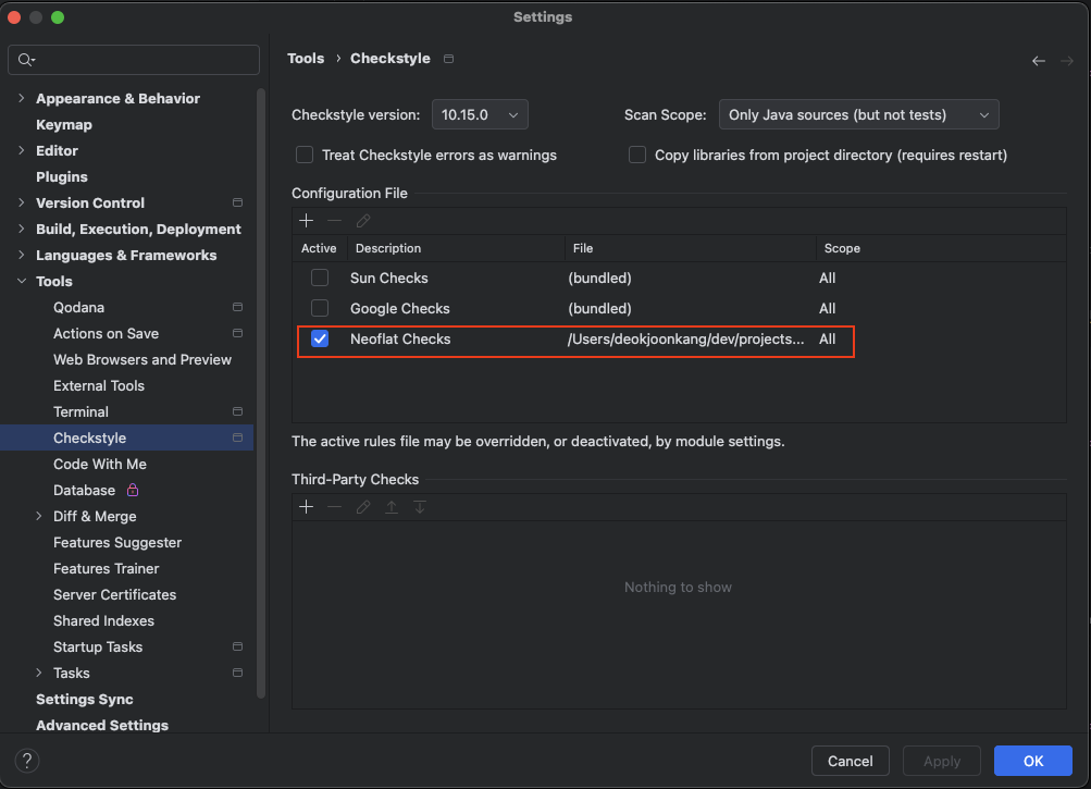 IntelliJ IDEA를 재시작하고 Settings -> Tools로 이동하게 되면 Checkstyle이 추가되어있다.
