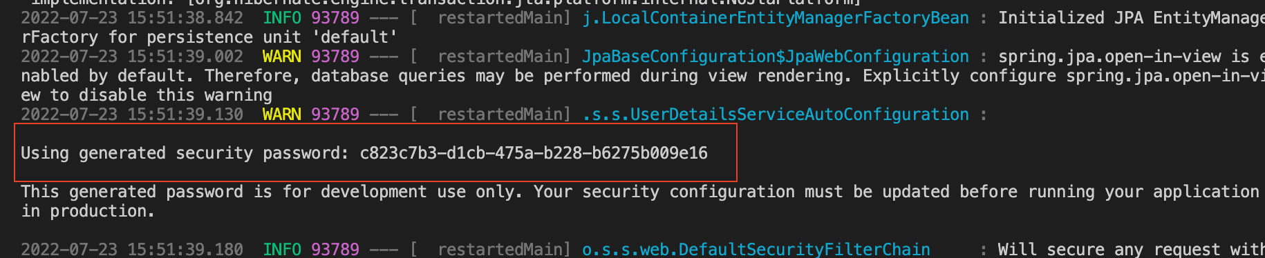 현재 상태에서 로그인 하려면 Username 은 user로 입력하고, Password는 아래 사진과 같이 어플리케이션 시작 로그에 표시되는 패스워드를 사용하면 된다.