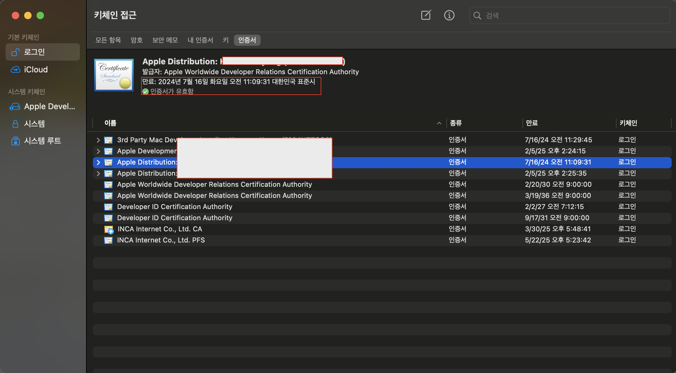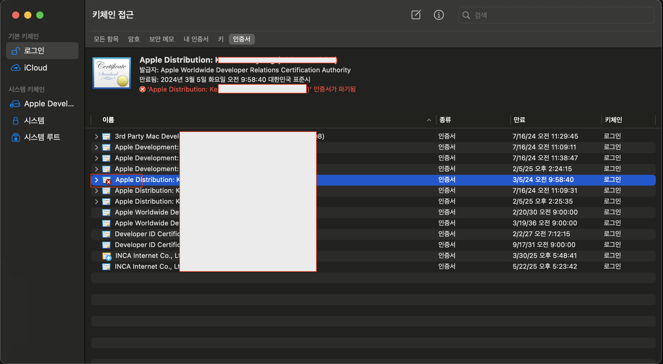 키체인 접근 -> 만료 및 사용하지 않는 인증서들 모두 삭제!