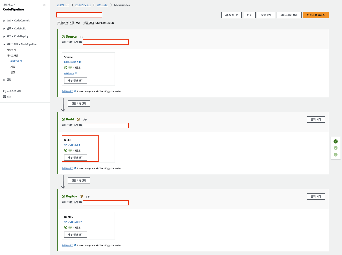Build : AWS CodeBuild -> 빌드 오류 확인 위와 같은 방식으로 빌드오류 확인 가능하다.