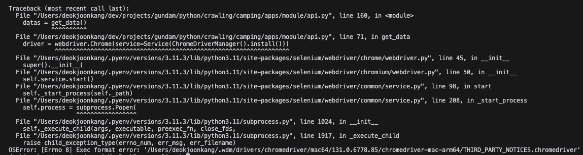 캠핑을 좋아해서 캠핑장소의 빈자리가 나면 알려주는 크롤링을 Selenium으로 개발해 둔게 있었는데, 크롬 드라이버 다운로는 받는 과정에서 에러가 발생하였다.
