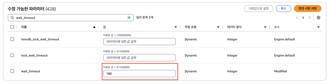 DB 파라미터 그룹 2.2. wait timeout 줄이기