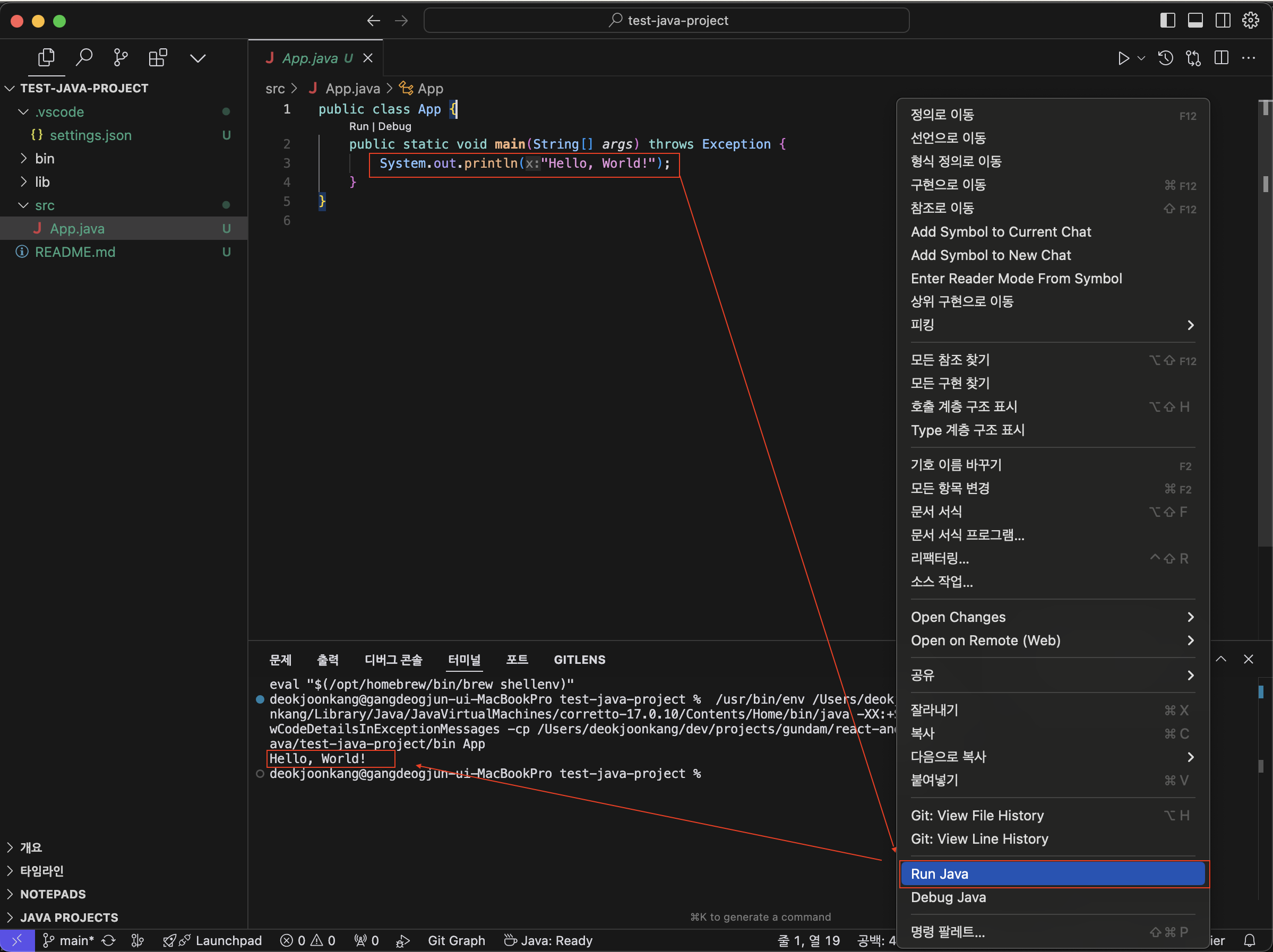 test-java-project 입력 새로생성된 프로젝트가 Cursor에서 열린다.