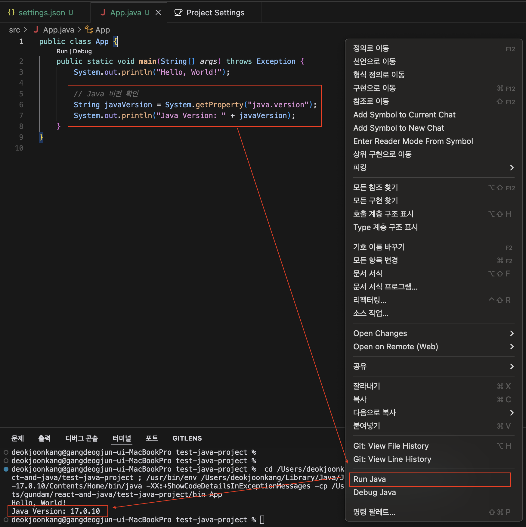 public class App { public static void main(String[] args) throws Exception { System.out.println("Hello, World!"); // Java 버전 확인 String javaVersion = System.getProperty("java.version"); System.out.println("Java Version: " + javaVersion); } }