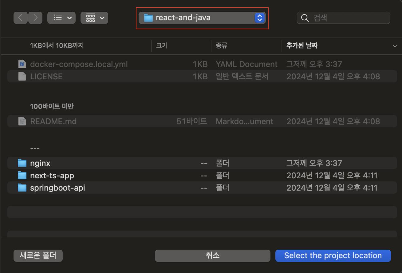 react-and-java 폴더 선택 프로젝트 폴더 이름 선택