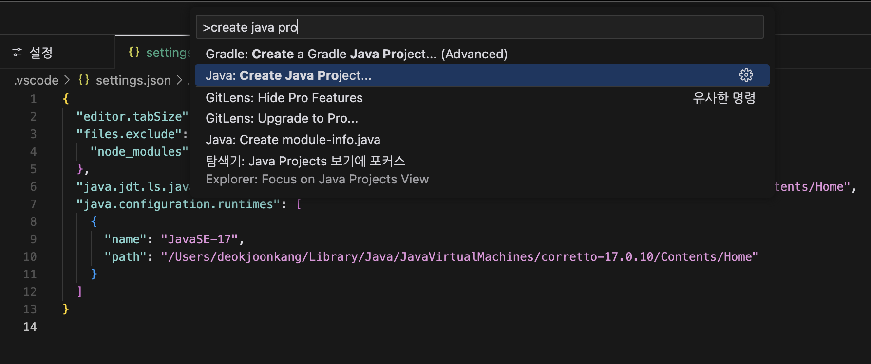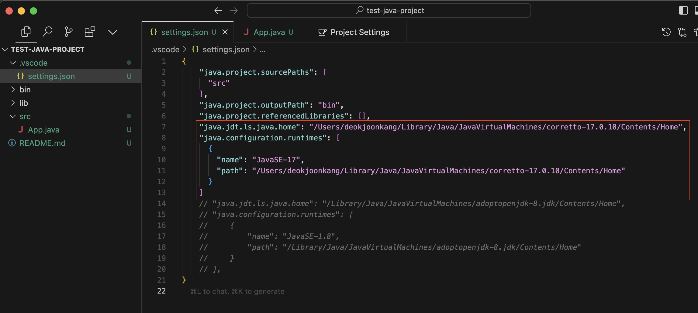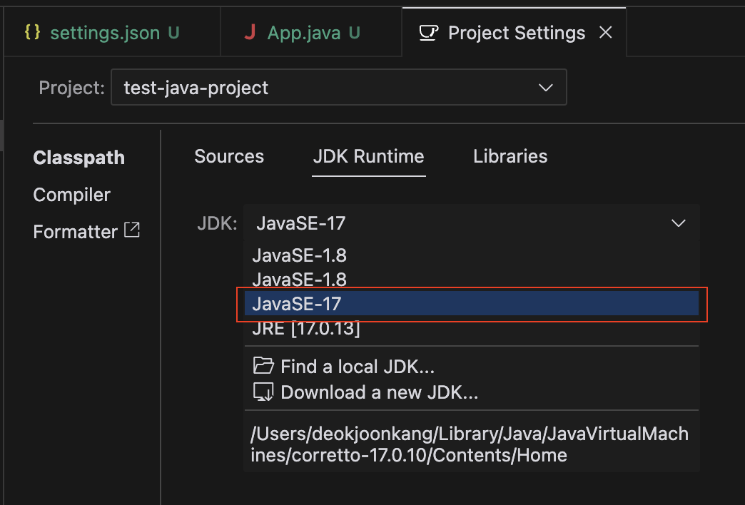 settings.json 설정이전 포스팅에서 설정했던 "java.home"에 설정했던 방식은 deprecated 되어서 아래와 같이 변경하였다.