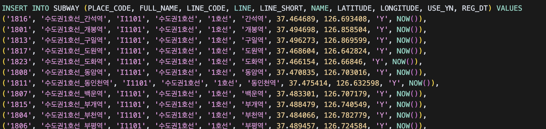 서울쪽은 대부분 처리하였지만 지방 철도까지는 너무 힘들어서 단기간에 필요한 데이터를 얻으려면 공식사이트에서 제공하는 엑셀 파일을 가공해서 사용하는게 좋다는 판단을 내렸다.