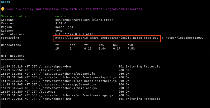 $ ngrok config add-authtoken <여기에_토큰_붙여넣기> # /Users/deokjoonkang/Library/Application\ Support/ngrok/ngrok.yml 생성됨3. ngrok 임시 url 생성