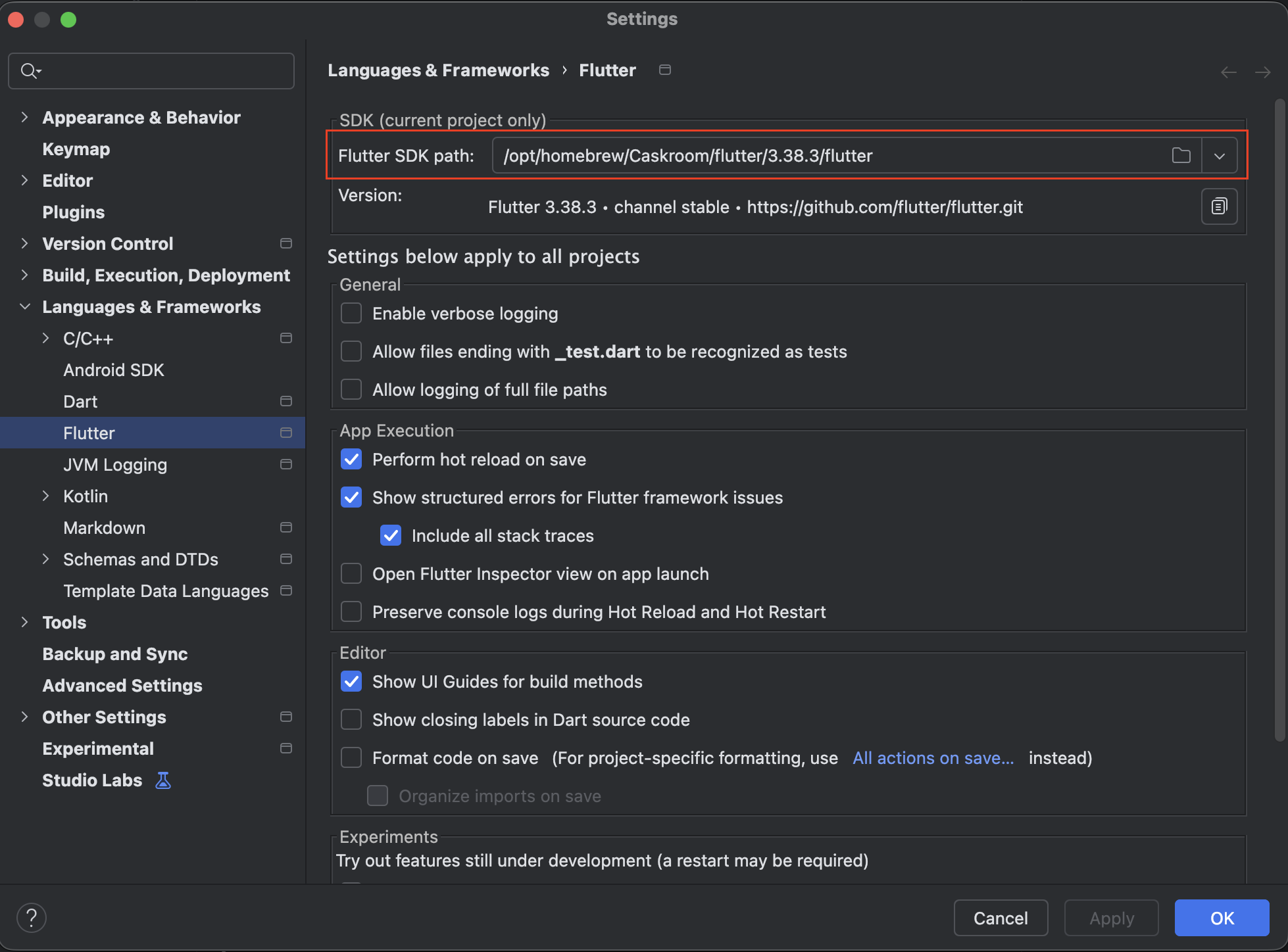 # 심볼릭 링크 따라가기 $ ls -l $(which flutter) >> /opt/homebrew/bin/flutter -> /opt/homebrew/Caskroom/flutter/3.38.3/flutter/bin/flutter # 버전으로 $ flutter --version -v $ flutter doctor -v # !!! 최종 !!! $ readlink -f $(which flutter) >> /opt/homebrew/share/flutter/bin/flutter ### 결론 >> /opt/homebrew/Caskroom/flutter/3.38.3/flutter