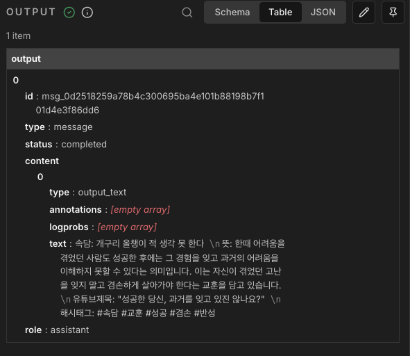 json.message.content는 이전 노드에서 생성된 속담을 가져와야해서 설정해 준다.