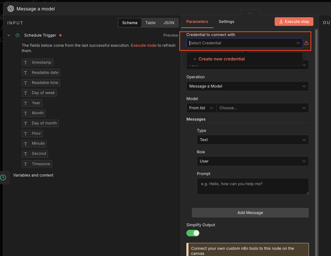 Select Credential -> Create new credential - OpenAI API키 만드는 법 (없으면)